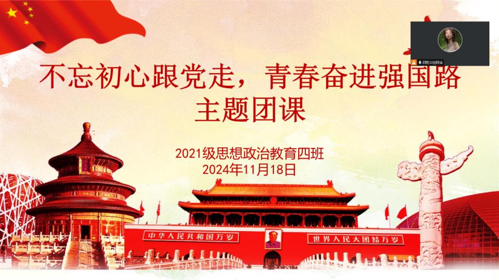 10月18日上午,七大罪 2021级思想政治教育四班在腾讯会议开展“不忘初心跟党走,青春奋进强国路”主题团课。2021级思想政治教育四班全体学生共同参加本次团课。团课由团支书刘珂含主持。